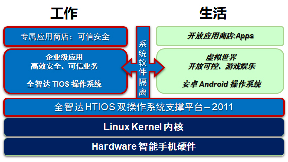 全智达发明的双系统架构实现了软件级的类红黑隔离架构的较高安全保障,满足当时市场的安全升级保护的要求,创造了“工作+生活”的两用移动终端模式。