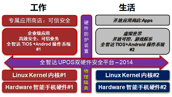 全智达于2013年-2014年间研发了第二代双系统技术,即DualHard双硬件双系统安全框架,实现了红黑隔离安全架构,达了“物理隔离+密码”的预先防御模式的高安全目标。