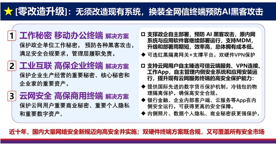 全网信TranCyber高安全终端解决了行业内“体积过大,功耗大,故障多,功能单一,体验差,不能跨网换号卡,不能跨境移动” 等长期难题,引领了高安全终端的发展。